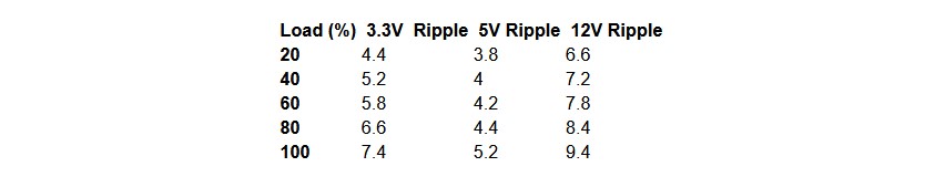When you consider that EU standards allow these to go as high as 50, you’ll note that across all the ranges and loads this power supply received in our test, not once did the figure go into double digits. This is very impressive and shows that the power is being delivered very cleanly indeed!