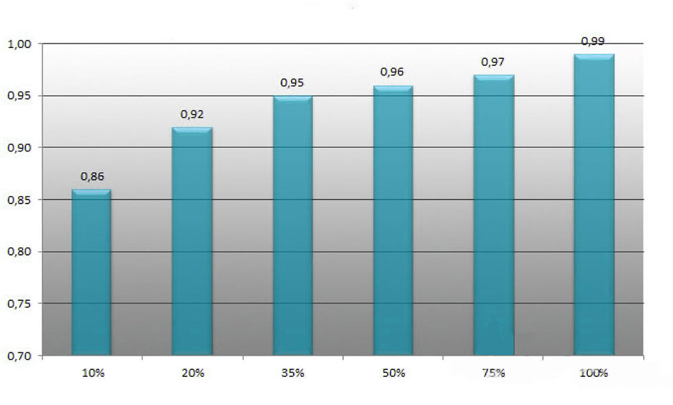 The power factor control system (APFC) reaches a value of 0.99 at full load and shows good progression.