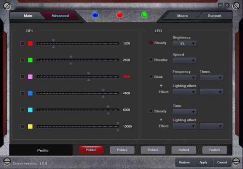 There is control of mouse sensitivity in different modes, there are settings for the color of the backlight, there are even macros that you can adjust. And you can change the values of all buttons.